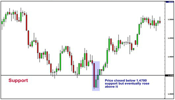 Quite often when a support or resistance level is broken, price tends to continue in the direction it was going until it faces another level of support or resistance, when price does break through it is defined as a "breakout". One important thing to remember is that when price breaks through a support level, that support level becomes a new resistance level, and when price breaks through a resistance level that level becomes a new support. You must take care when trading breakouts, as sometimes price can breakout and then reverse into the opposite direction, this is known as a "fakeout". You may be asking yourself, "how do I know when it's a breakout or a fakeout?" well there isn't a definite answer, but there are things that can help your chances in predicting correctly. One way is to wait for price to come back and retest a support or resistance level if it holds then chances are the original breakout was legit, if it breaks through that level then it was a fakeout. Below is an example of a fake out.